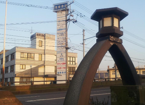 兼六園の徽軫灯籠(ことじとうろう)を模した灯籠からの当事務所ビル